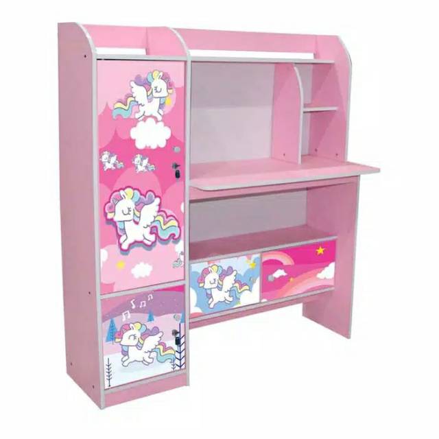 Anda dapat memilih model meja belajar anak yang bertemakan kartun favoritnya seperti rapunzel frozen my little pony mermaid atau karakter princess lainnya.