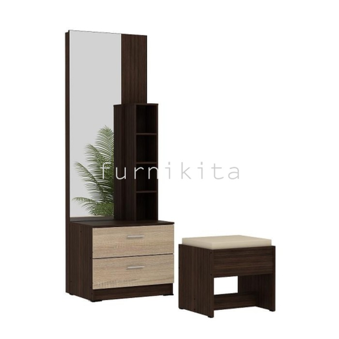 Meja rias ini terbuat dari particle board mix laminated. Ingin terlihat menawan di depan orang lain bisa dikatakan sebagai salah satu sifat dasar manusia yang tidak bisa dipungkiri terutama bagi perempuan.