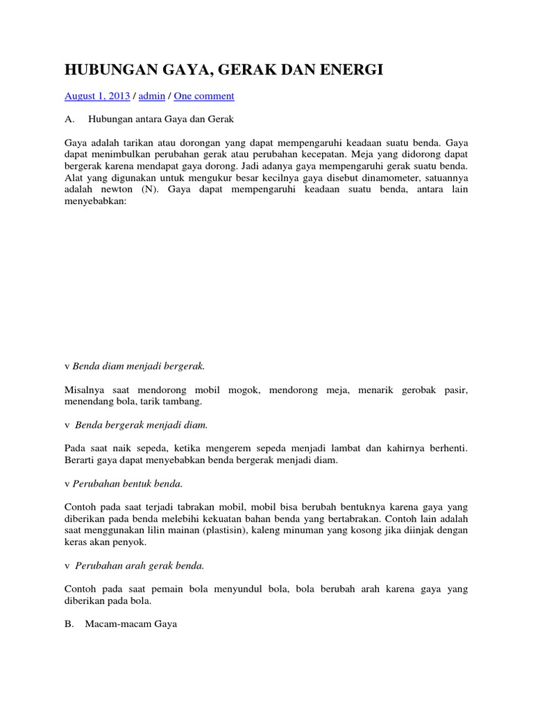 Gaya dapat mempengaruhi keadaan suatu benda antara lain gaya dapat menyebabkan. Meja yang didorong dapat bergerak karena mendapat gaya dorong. Gaya dapat menimbulkan perubahan gerak atau perubahan kecepatan. Meja yang didorong dapat bergerak karena mendapat gaya dorong.